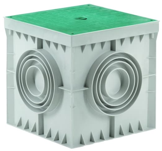 Дана позиція має 4 виходи під трубу, що значно спрощує монтаж, габаритні розміри виробу 300x300x300. Колодязь має зелену кришку, яка йде у стандартній комплектації.